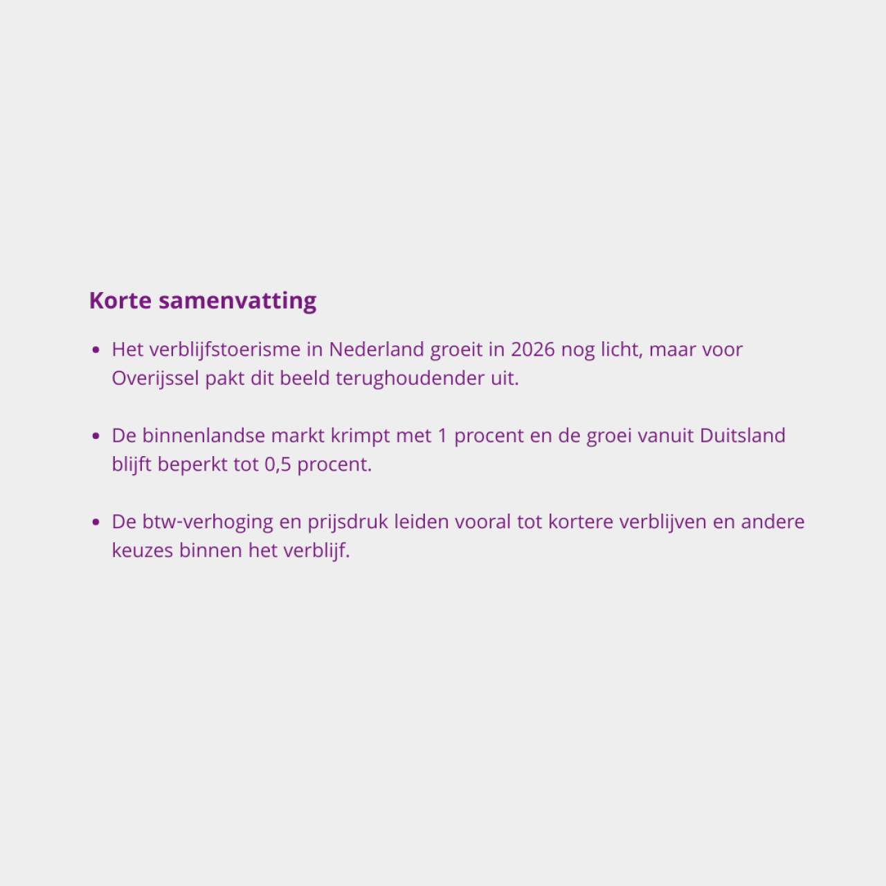 Tot slot maakt de combinatie van binnenlandse krimp en beperkte groei vanuit Duitsland duidelijk dat zowel aantallen als verblijfskenmerken onder druk kunnen staan. Voor ondernemers betekent dit dat niet alleen het aantal gasten relevant is, maar ook hoe en wanneer zij verblijven, en hoe dit past bij de eigen locatie en het aanbod in Overijssel.