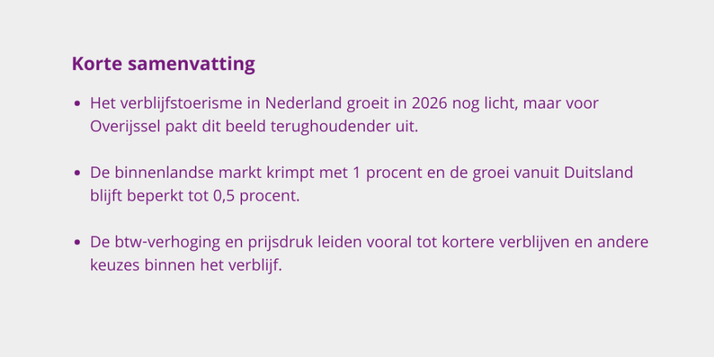 De forecast voor 2026 laat voor Overijssel vooral een verandering in gedrag zien. De binnenlandse markt staat onder druk, de Duitse markt groeit nog slechts beperkt en prijsgevoeligheid neemt toe. Dit werkt door in verblijfsduur, type accommodatie en de keuze tussen regio’s.